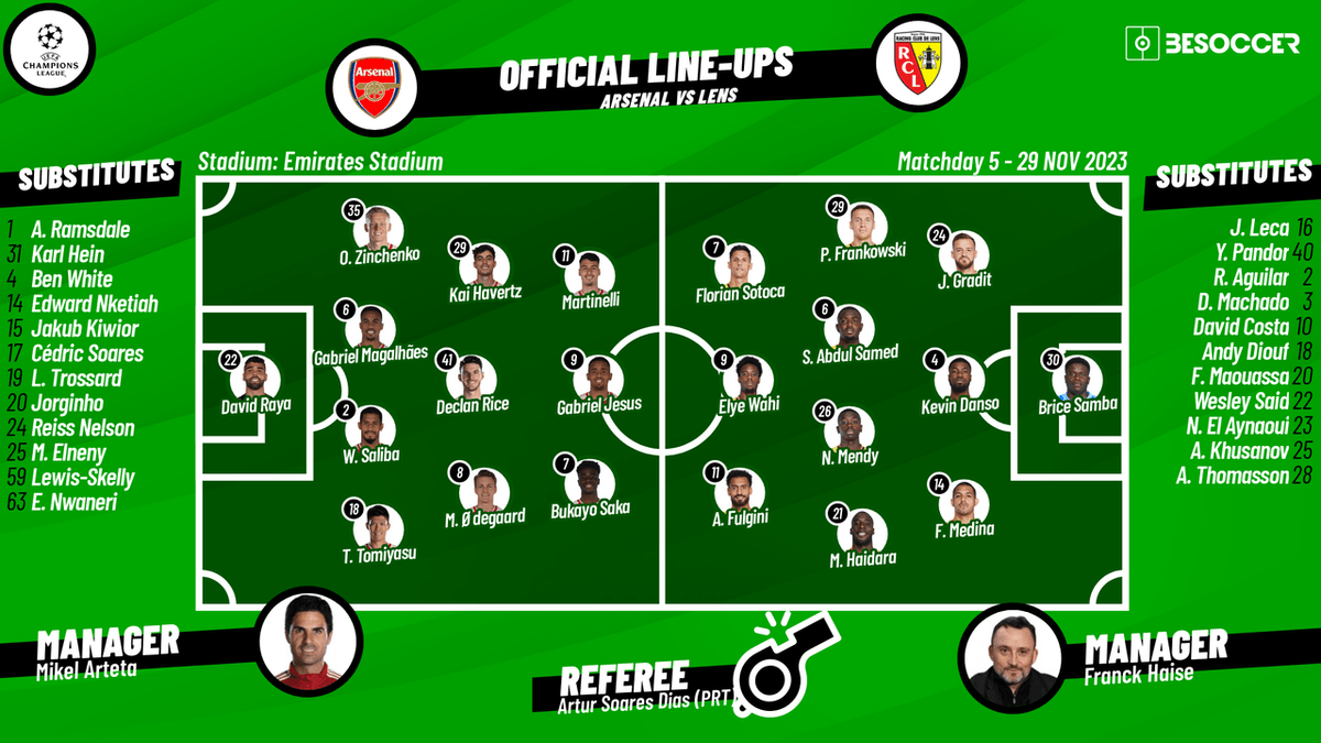 Web Arsenal vs RC Lens K Havertz 13 G Jesus. . Web Lens starting 11 3-4-3 Samba GK Gradit Danso Medina Frankowski Mendy Samed Haidara Sotoca Wahl Fulgini. Web Simon Collings sr_collings November 29 2023 Kai Havertz has been handed a place in Arsenal s starting line-up for tonights match against RC Lens. Web Nov 29 2023 at 8pm UK Havertz 13 Jesus 21 Saka 23 Martinelli 27 Odegaard 451 Jorginho 86 pen FT HT..